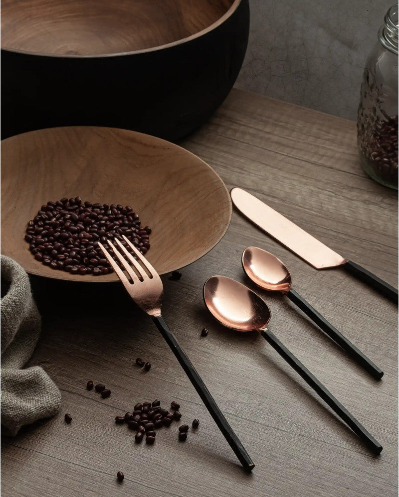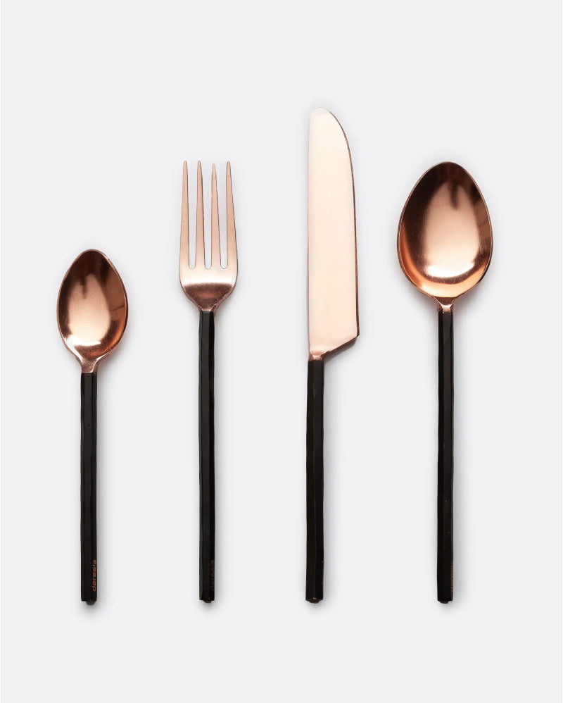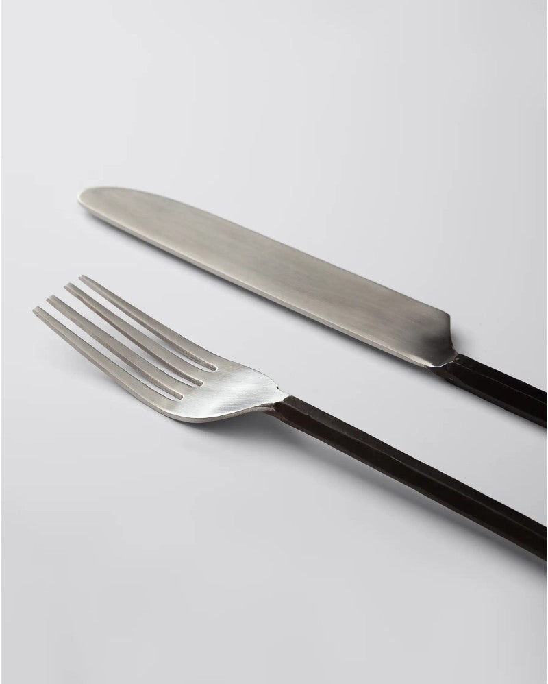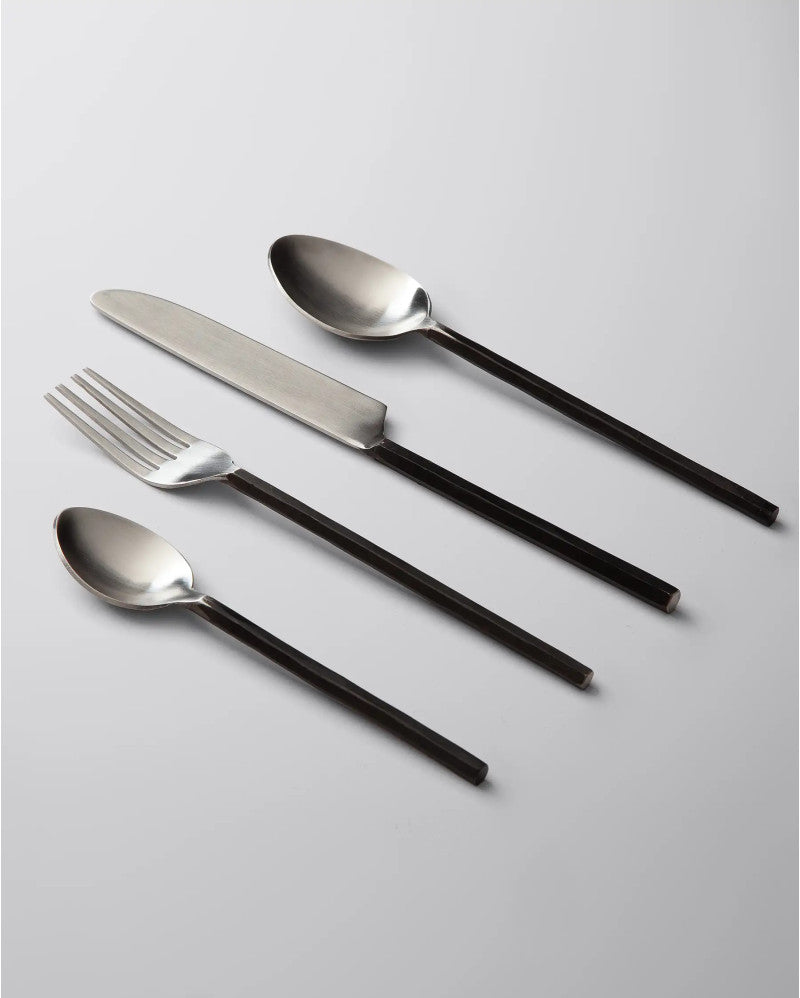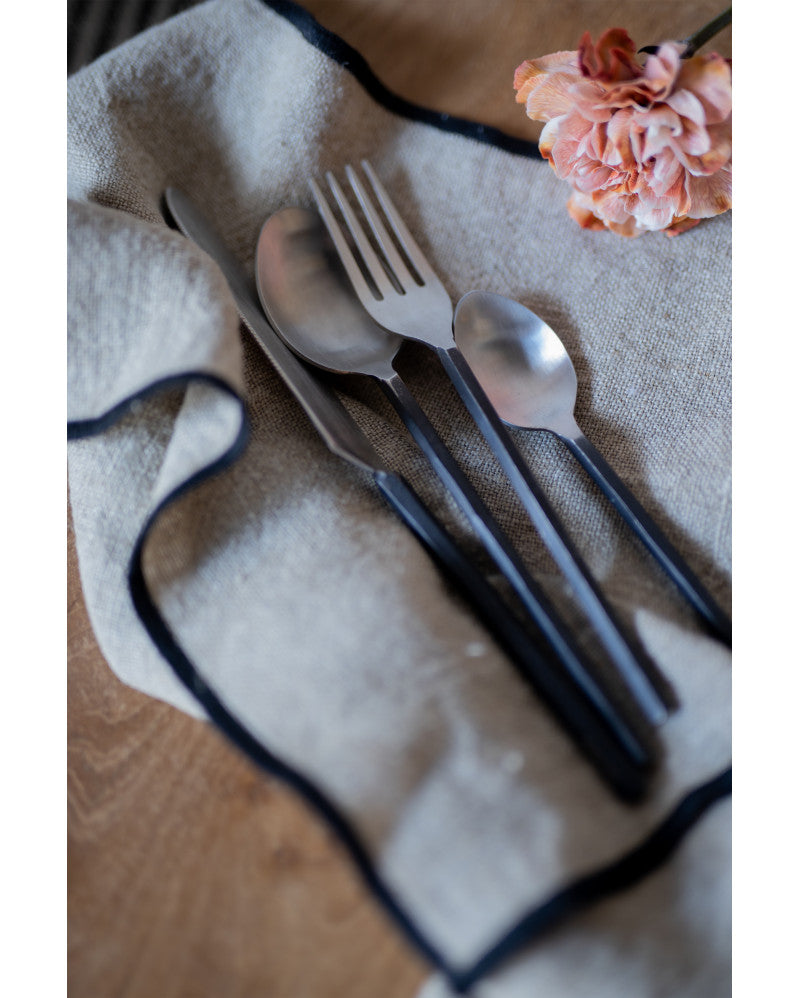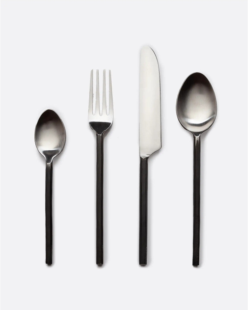 - Комплект прибори за хранене от неръждаема стомана в сребрист цвят с черна матова дръжка. Изискани прибори за ежедневна и специална употреба. Този пълен комплект от 4 части включва: вилица, нож, лъжица за супа и лъжица за десерт.
