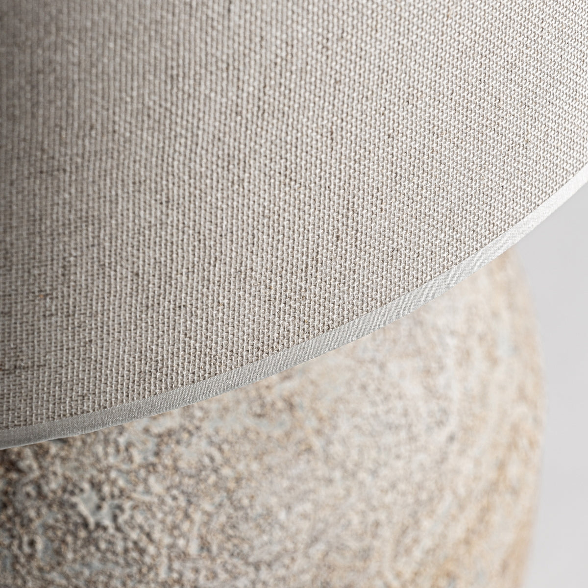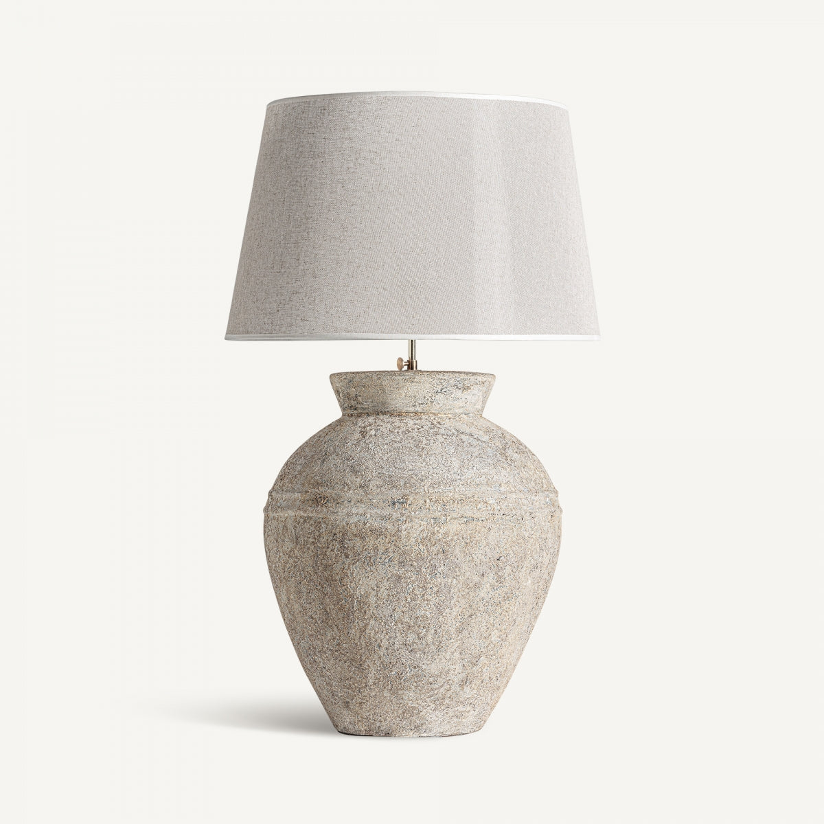 В светли тонове и състарено покритие, тази провансалска лампа съчетава керамика и сив памук, за да създаде меко осветени, спокойни пространства.