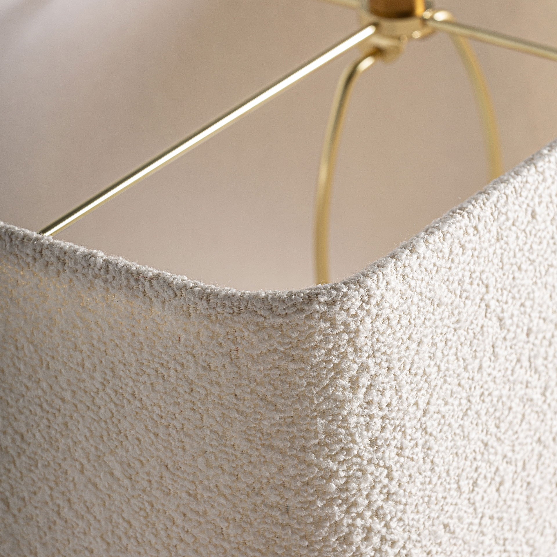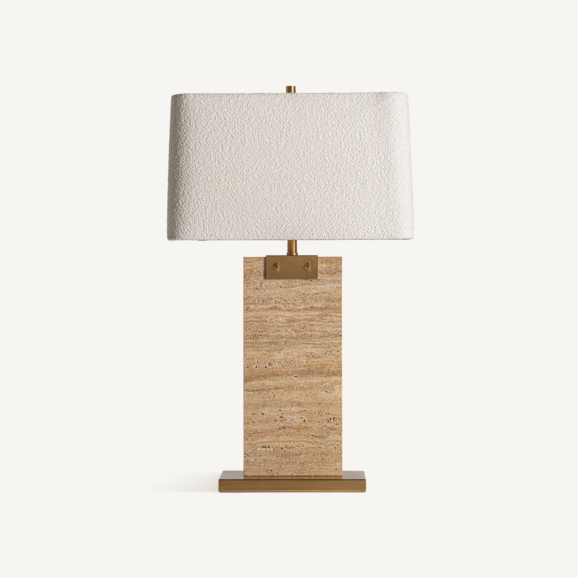 Настолна лампа, стил арт деко, изработена от травертин в кафяво, комбиниран със златно желязо и почти бяло букле памук. Продуктът е подвижен.
