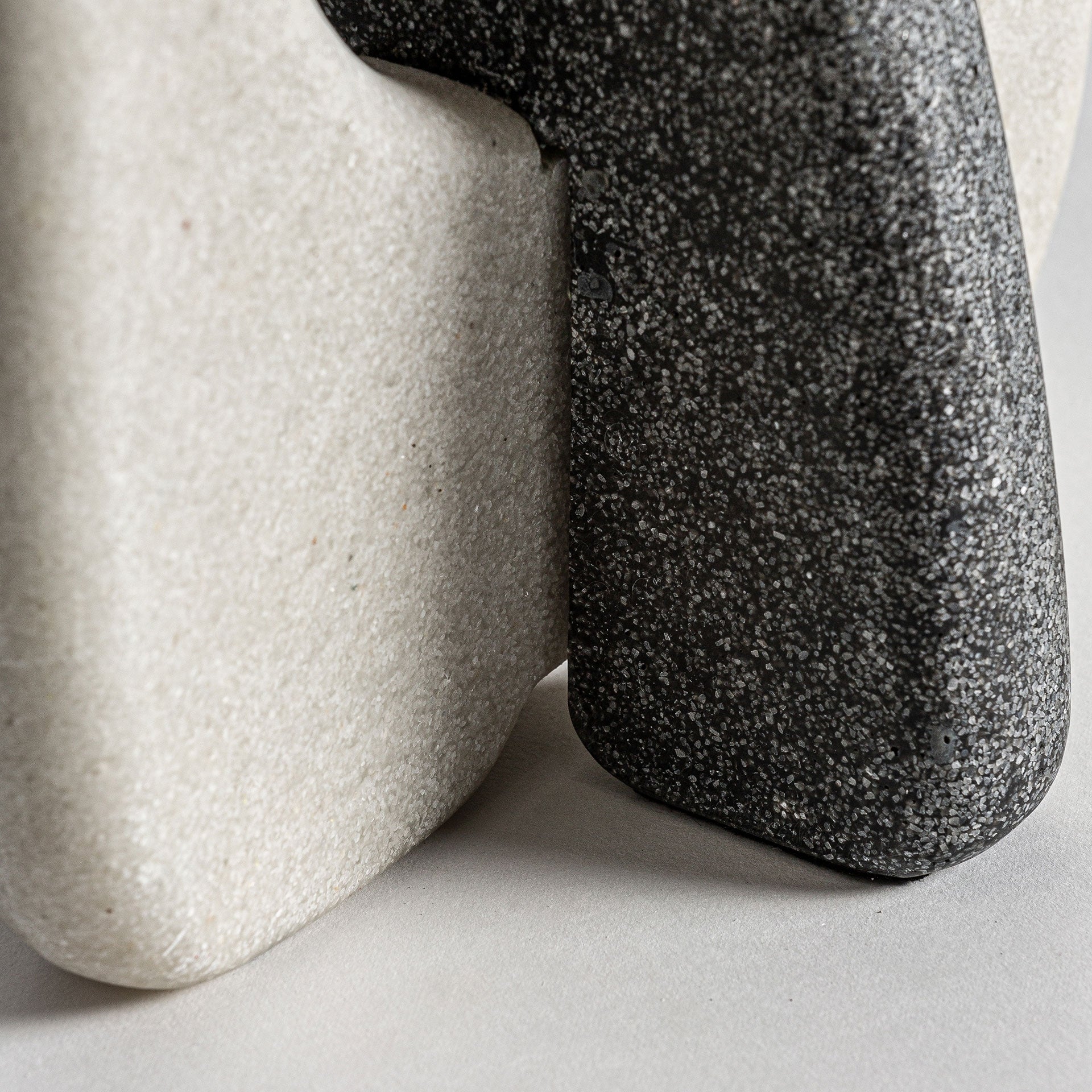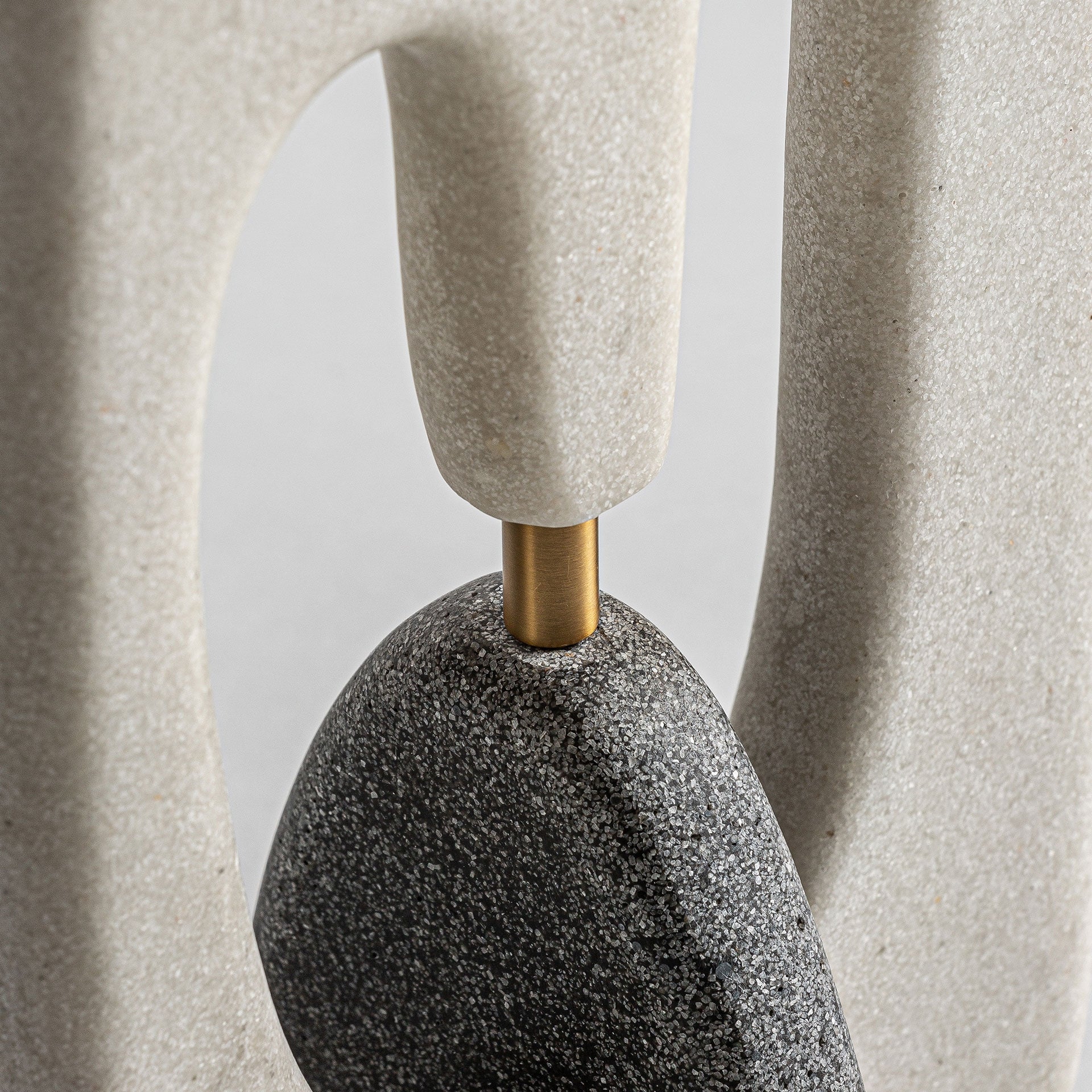 Настолна лампа, съвременен стил, изработена от оризов камък в сиво, комбинирана с бронзово желязо и бял памук. Продуктът е подвижен.
