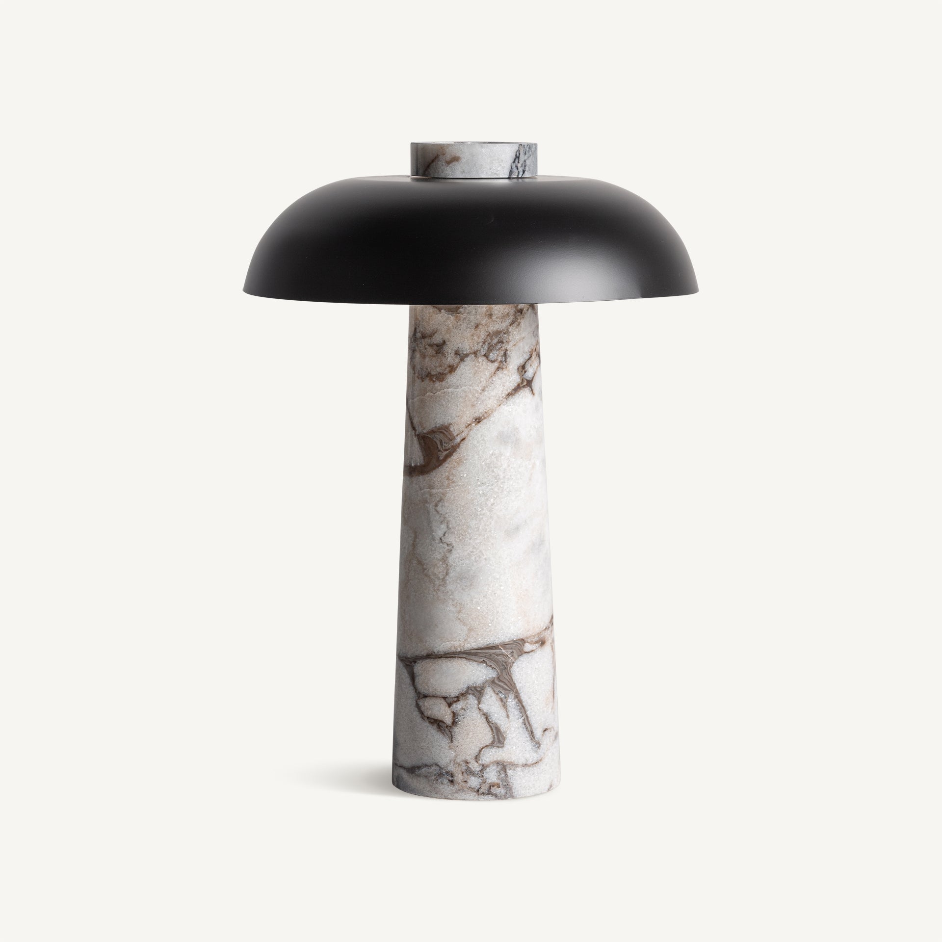 Настолна лампа, стил арт деко, изработена от мрамор в бяло, комбиниран с черно желязо с матово покритие. Продуктът е разглобяем.