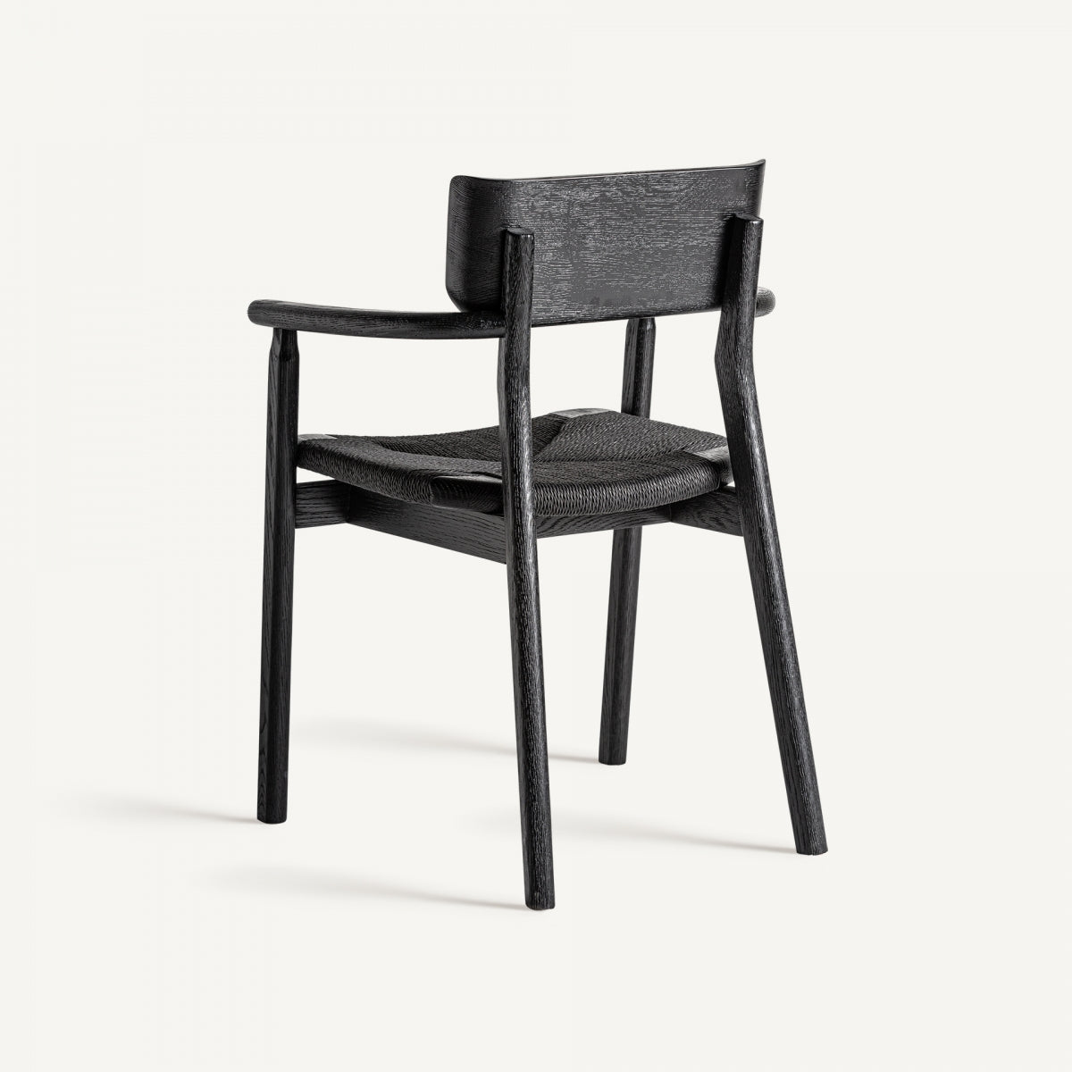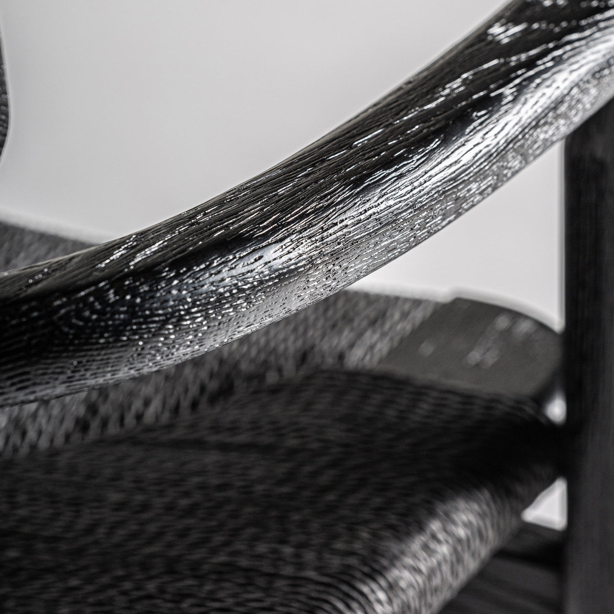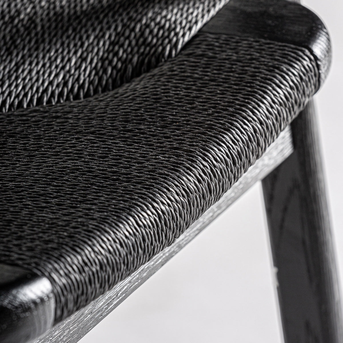 Стол TAMMY стил винтидж, изработен от дъбова дървесина в черен цвят с матово покритие, комбиниран с черни естествени влакна.
