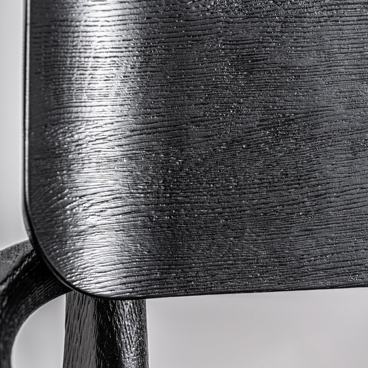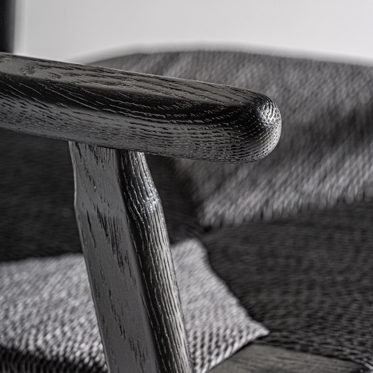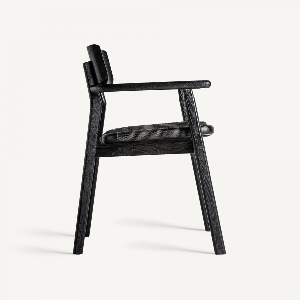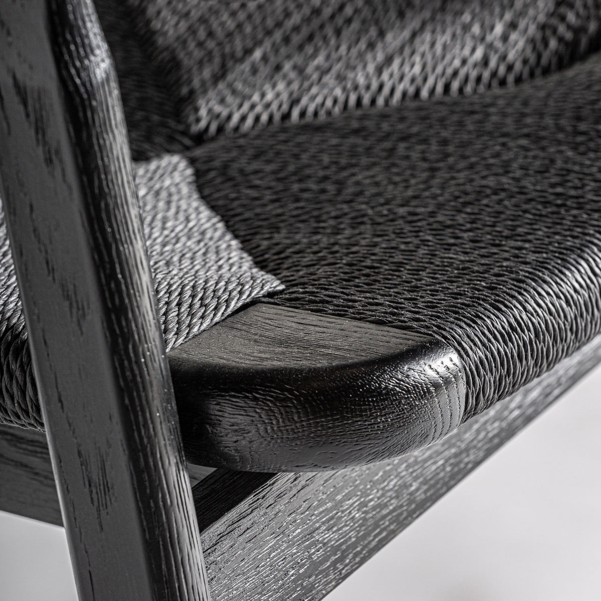 Стол TAMMY стил винтидж, изработен от дъбова дървесина в черен цвят с матово покритие, комбиниран с черни естествени влакна.