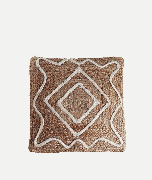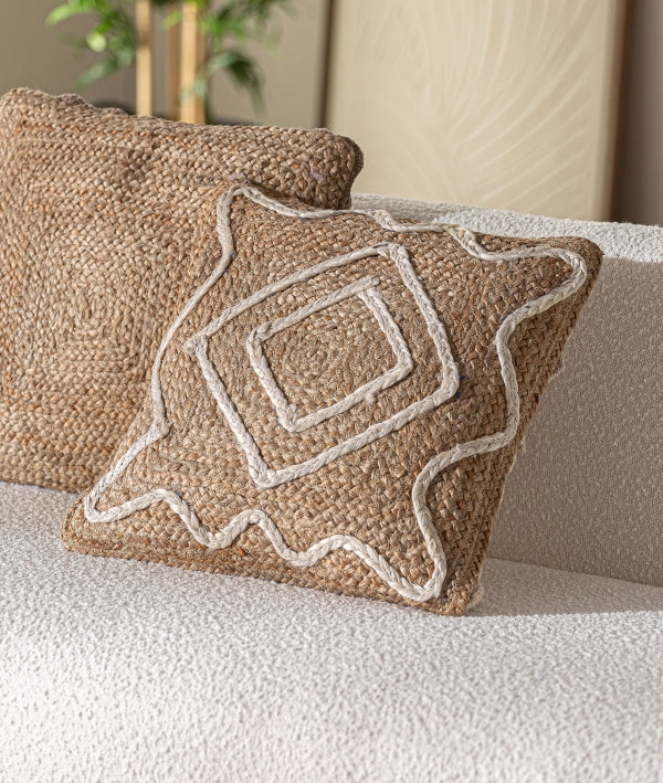 Квадратна възглавница thiesi, стил бохем, изработена от юта в кафяво, комбинирана с бежов полиестер. Продуктът е сваляем.