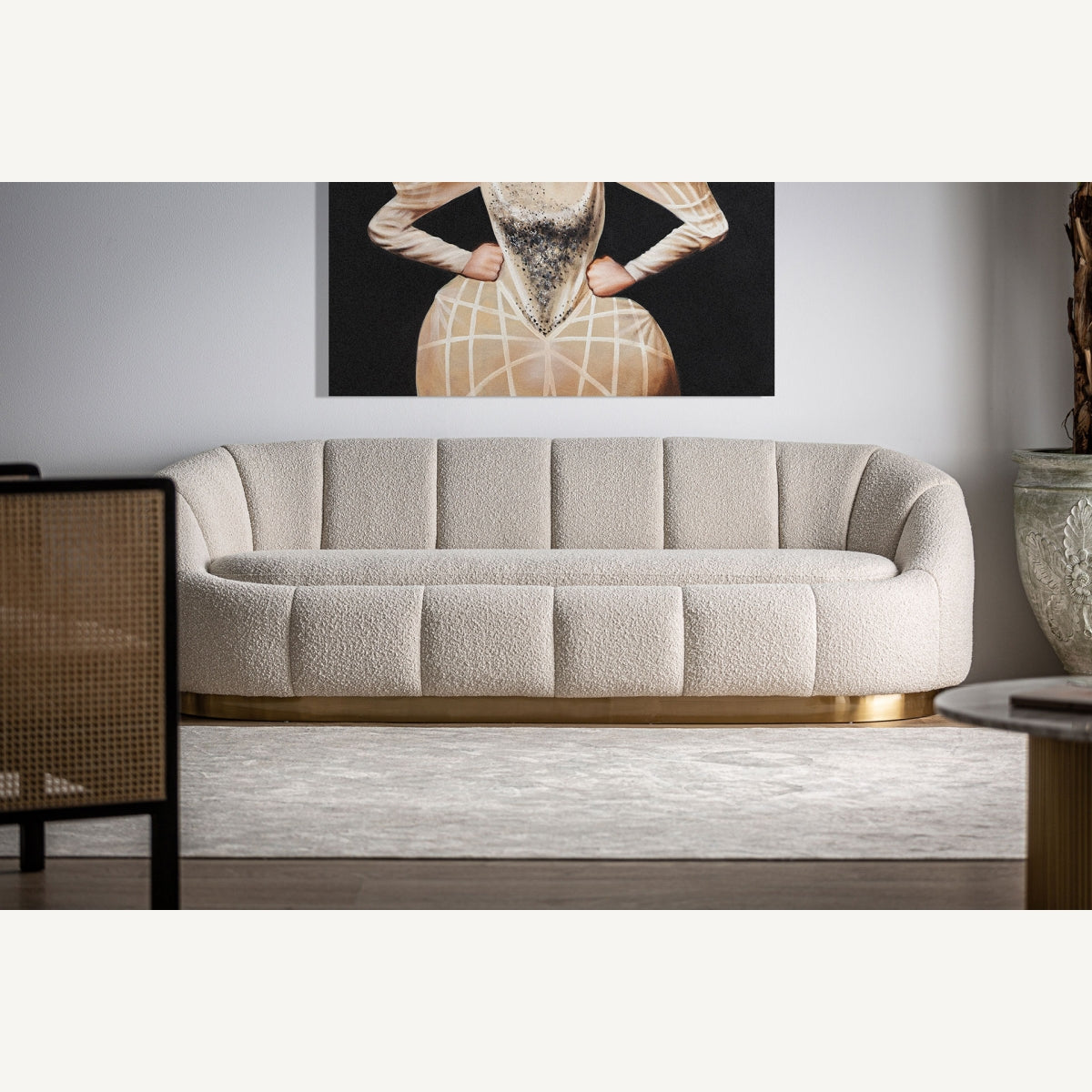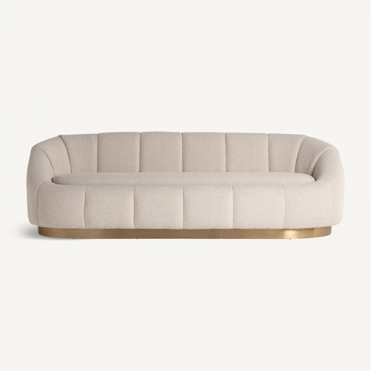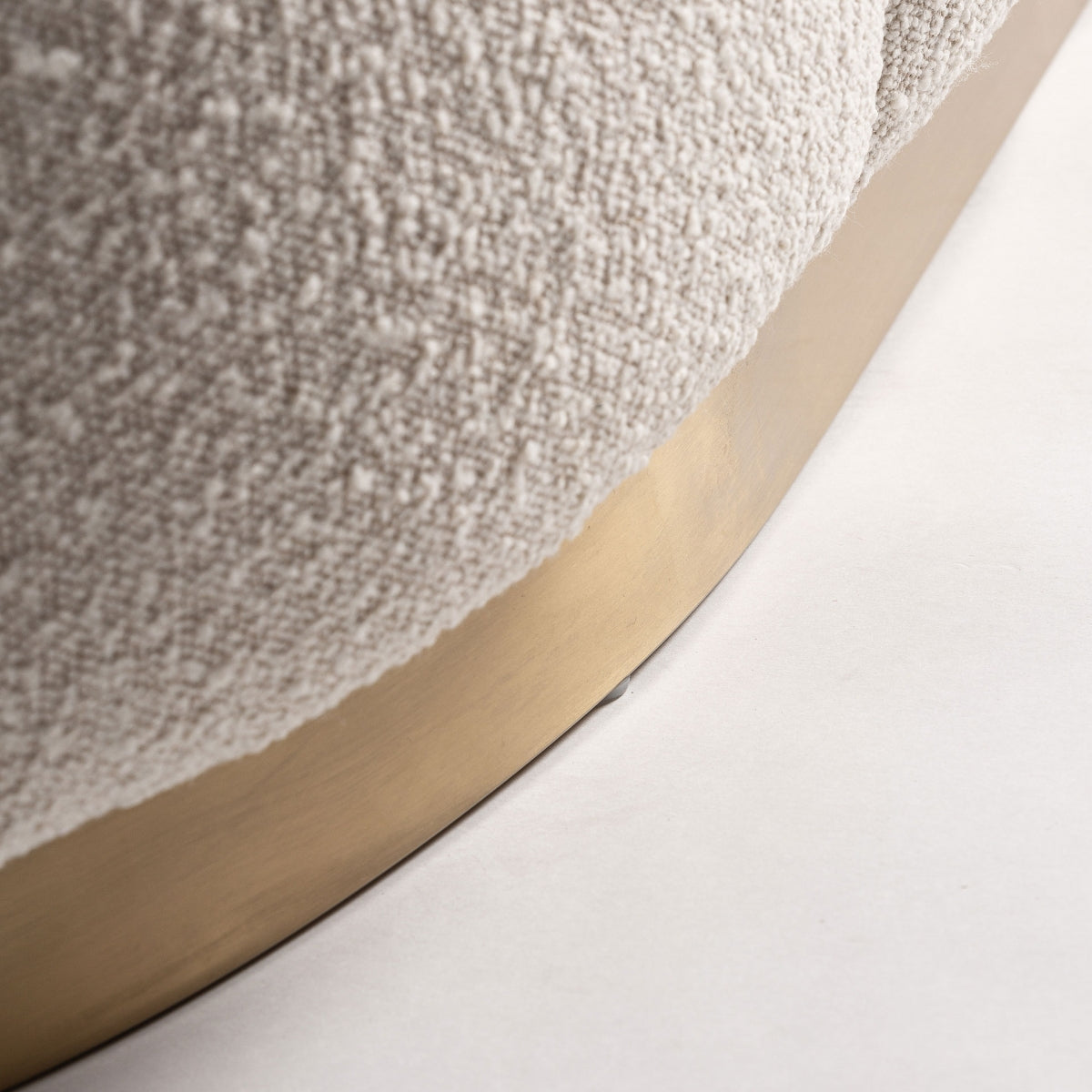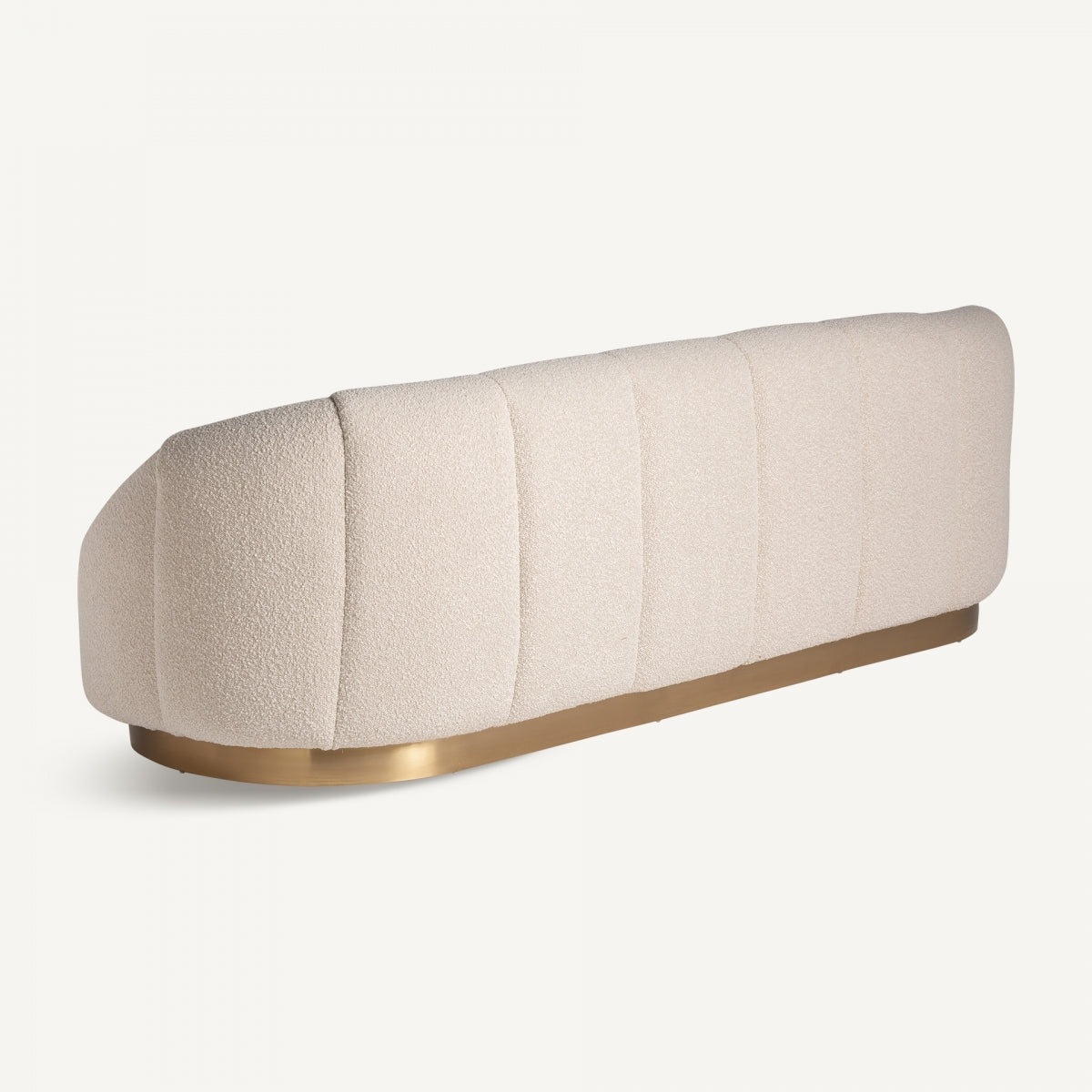 Диван Thyez Bouclé, стил арт деко, изработен от памук букле в бяло, комбиниран със златна стомана и борово дърво.