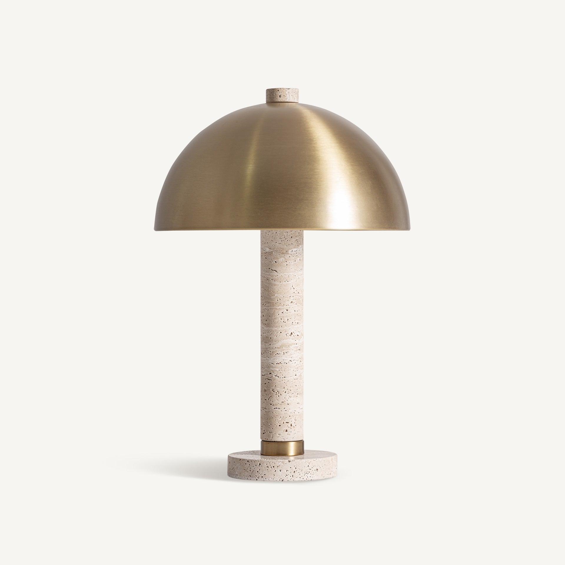 Настолна лампа, стил арт деко, изработена от травертин в цвят слонова кост, комбинирана със златно желязо. Продуктът е разглобяем.