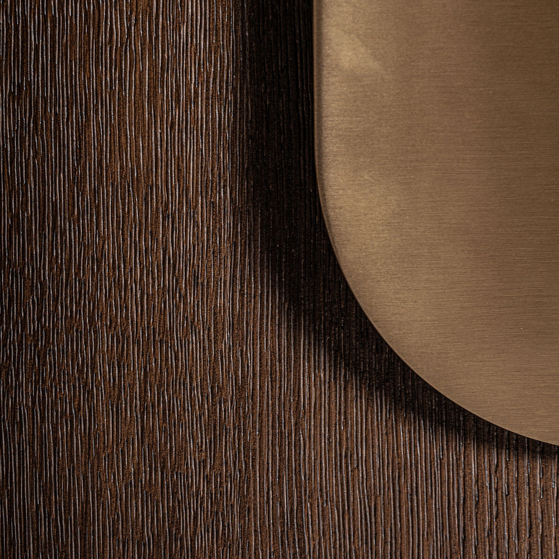 Централният елемент е скулптурна дръжка в златист цвят, създаваща поразителен контраст с богатата дървесна шарка. Проектирана за модерен интериор, тази мебел съчетава естествена топлина с метална изтънченост – идеална за вашия дом или бутиков хотел.
