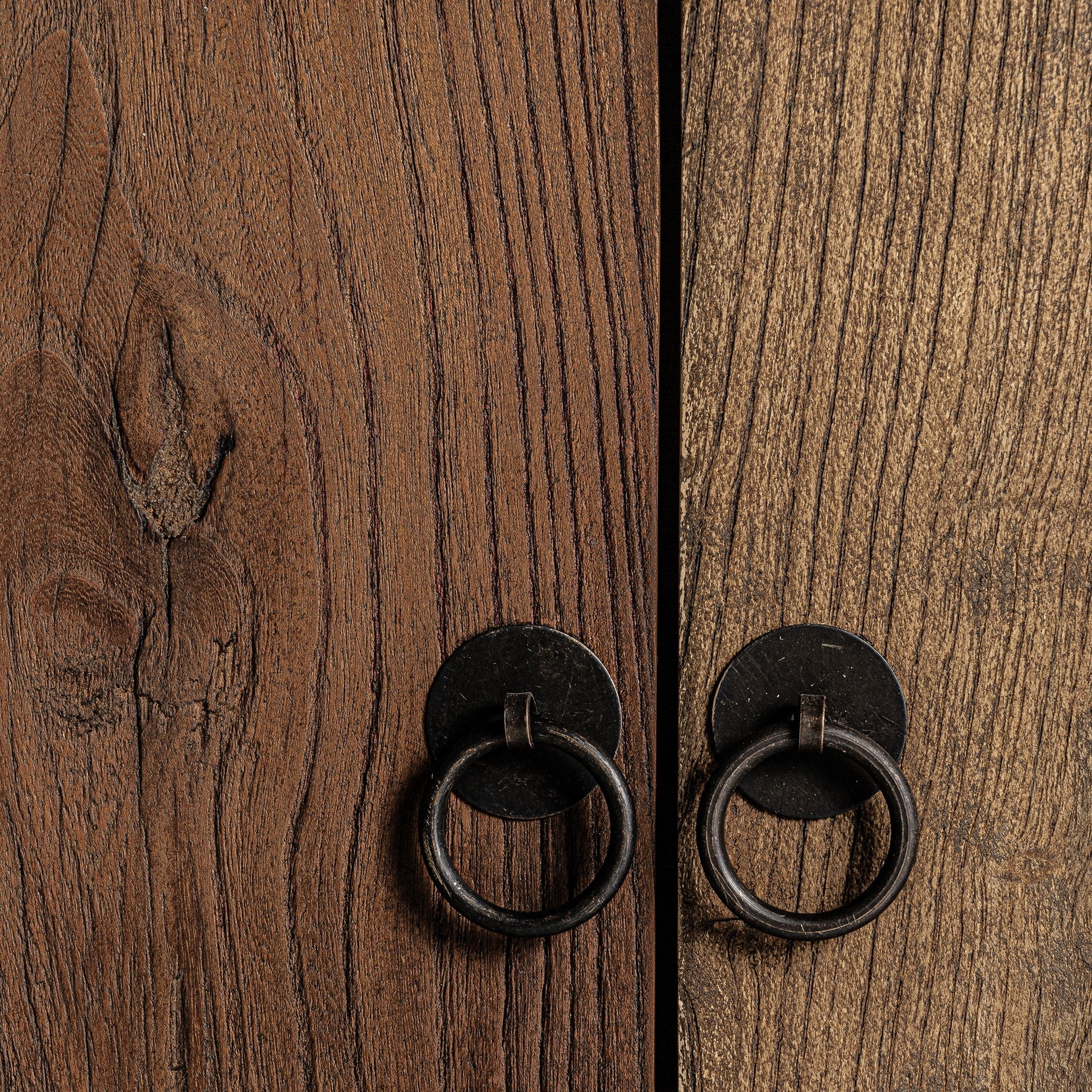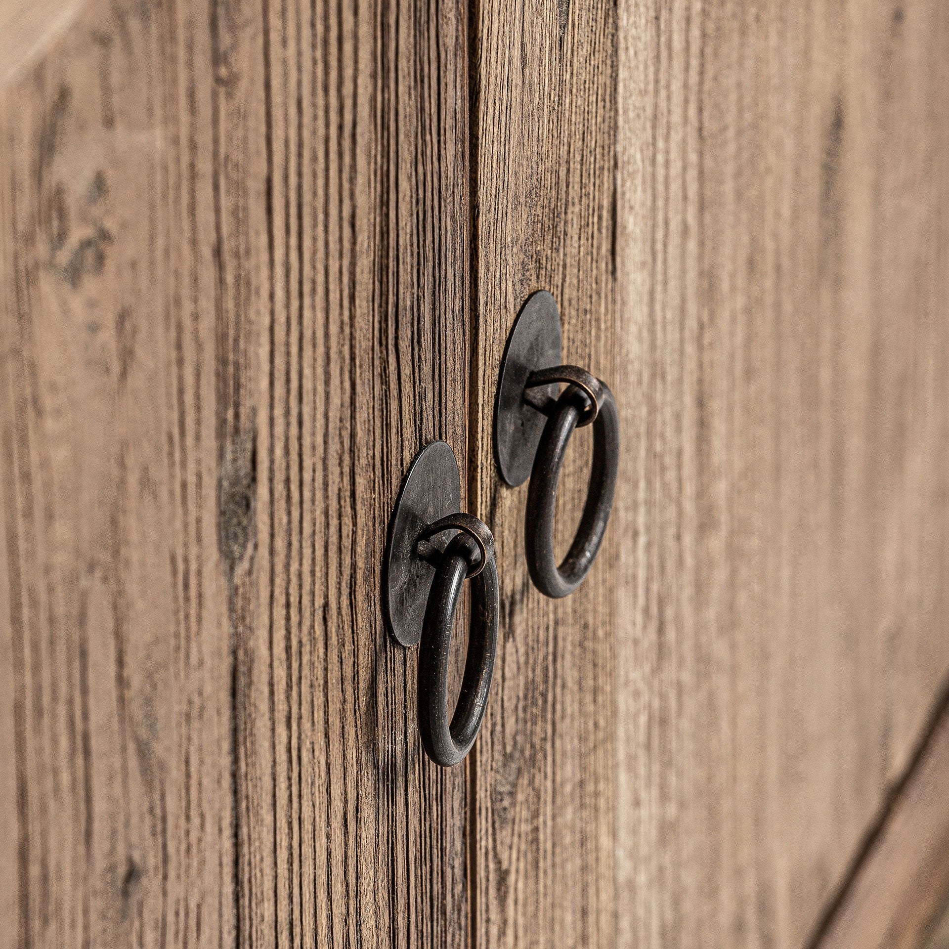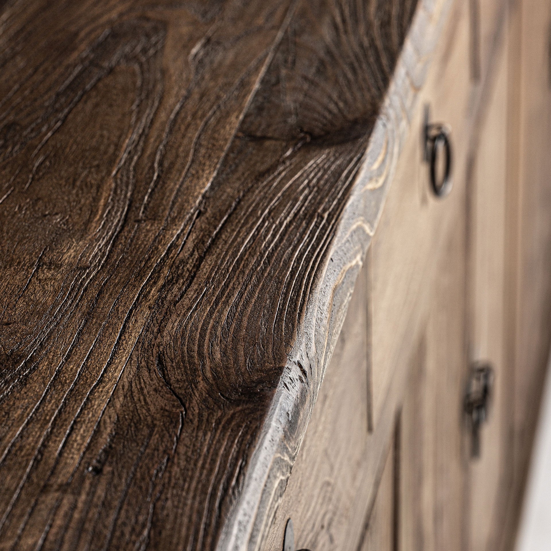 Изработен от богато кафяво брястово дърво, този бюфет с дължина 250 см съчетава рустик характер с модерна елегантност. Удълженият му силует се отличава с четири горни чекмеджета и шест вертикално облицовани вратички тип „рафт“, предлагащи щедро скрито място за съхранение. Естествената дървесна шарка и изтърканото покритие извикат занаятчийска топлина, докато минималистичните железни дръжки добавят фин индустриален щрих. Идеален за просторни трапезарии, интериори с отворен план или пространства в галериен стил.