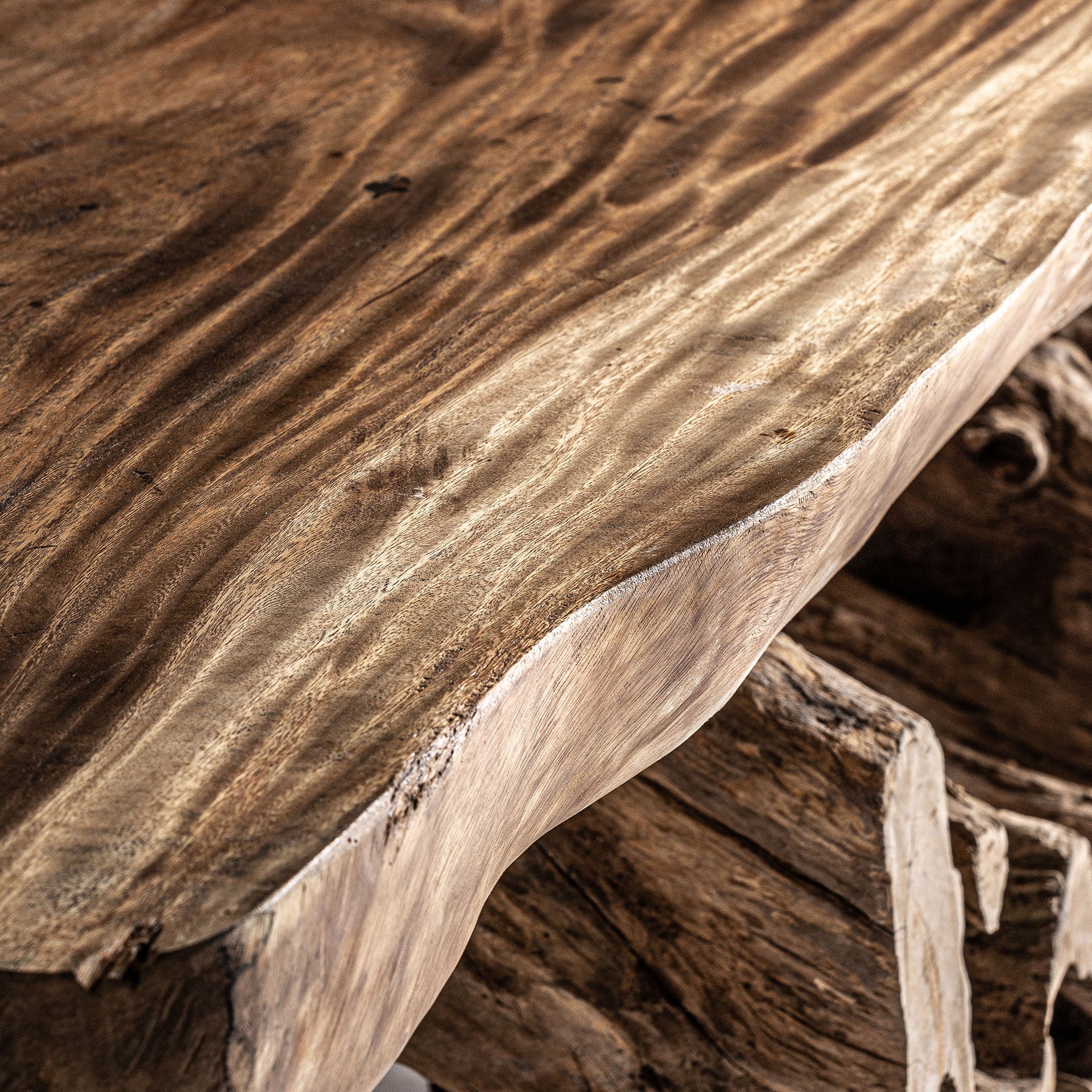Холната маса Kanye е празник на органичното изкуство и етническата елегантност . Ръчно изработена от суарово дърво в топъл кафяв тон с ефект на износване , всяка мебел е уникална , оформена от природата и усъвършенствана от майстори. Скулптурната ѝ основа и суровите текстури извикат усещане за коренна красота, което я прави впечатляващ централен елемент във всеки интериор.