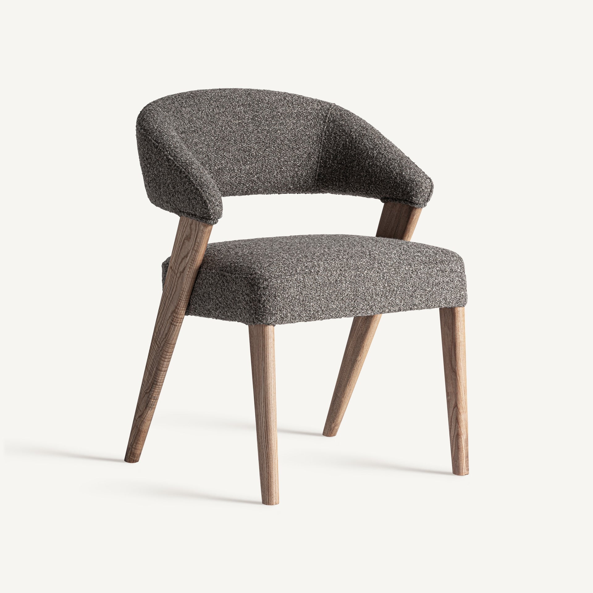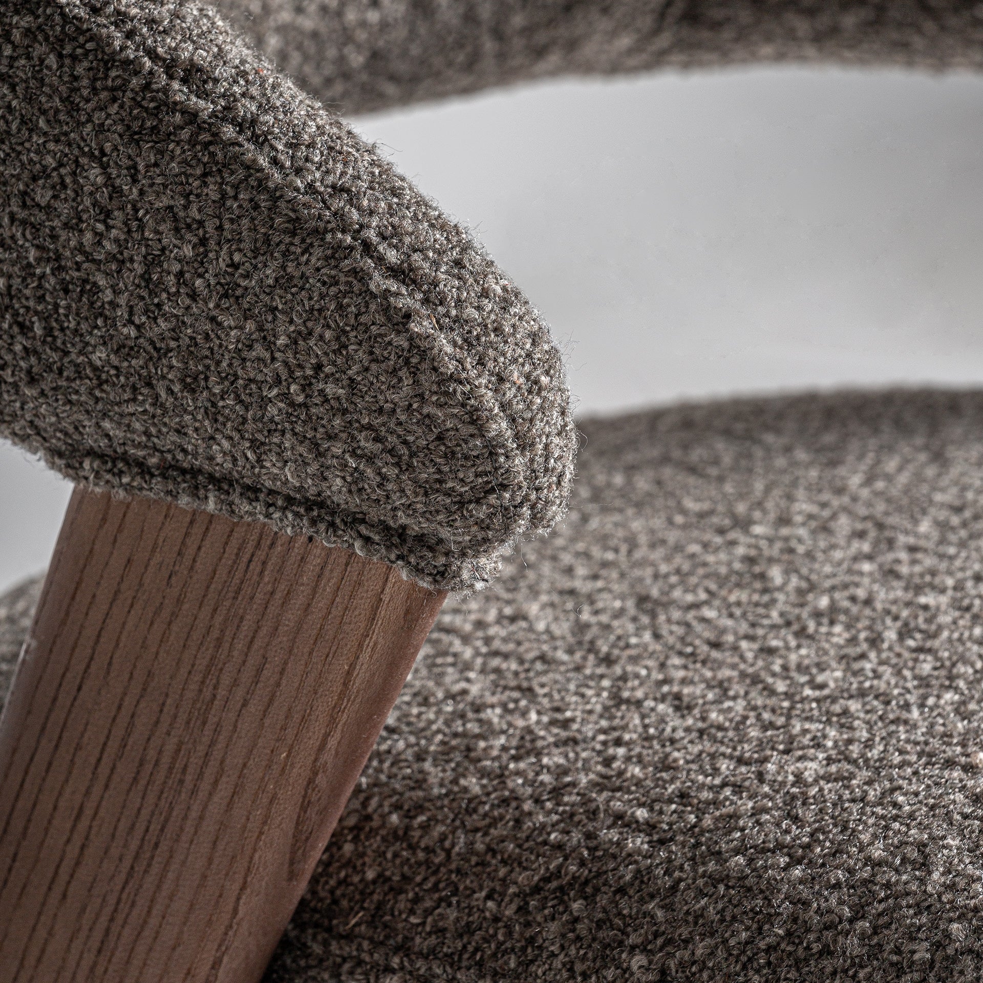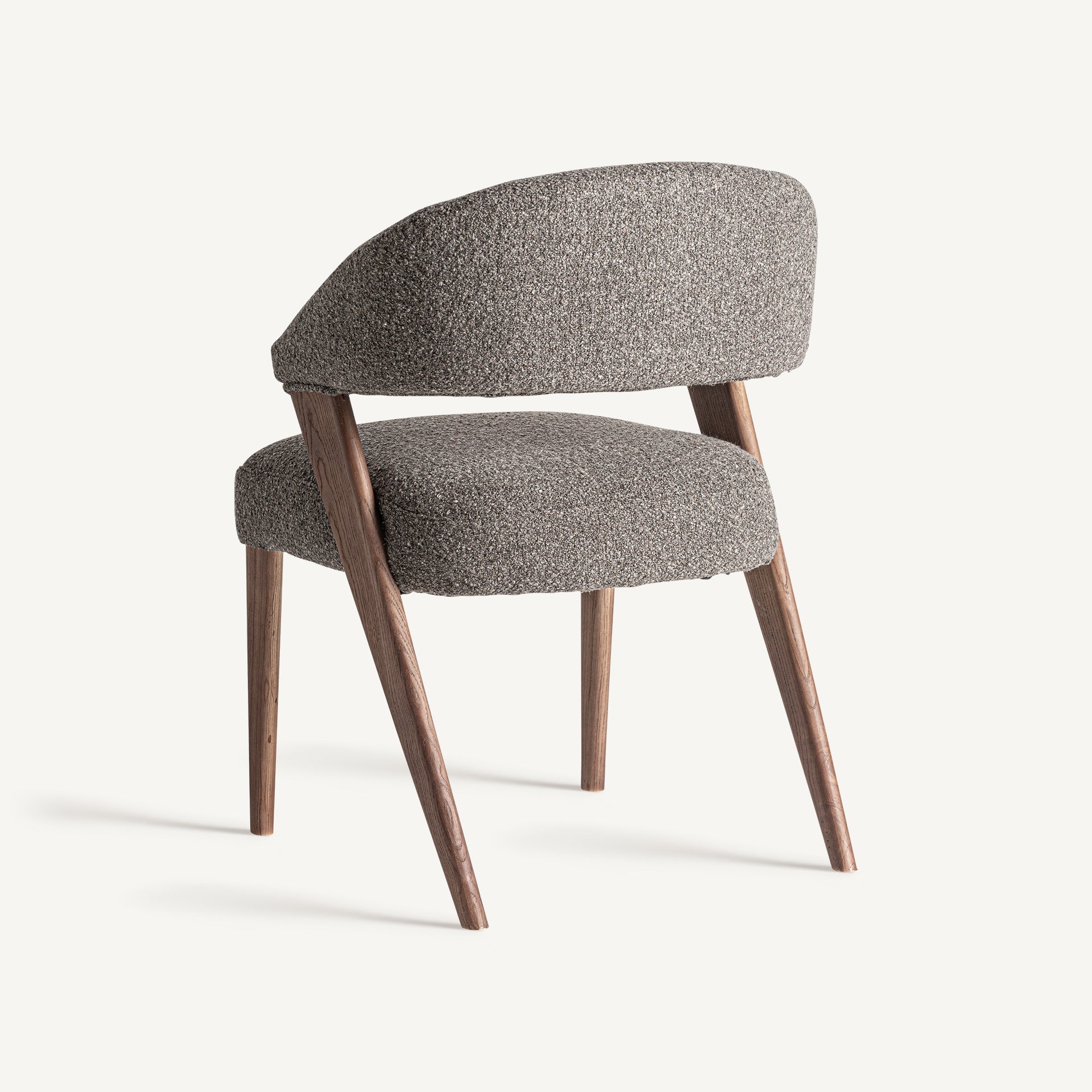 Столът Veney от VICAL, тапициран с пъстър сив полиестер, е поставен върху конструкция от кафяв дъб и каучуково дърво. Меките му линии и ергономичната облегалка предлагат удобно и елегантно изживяване при сядане.