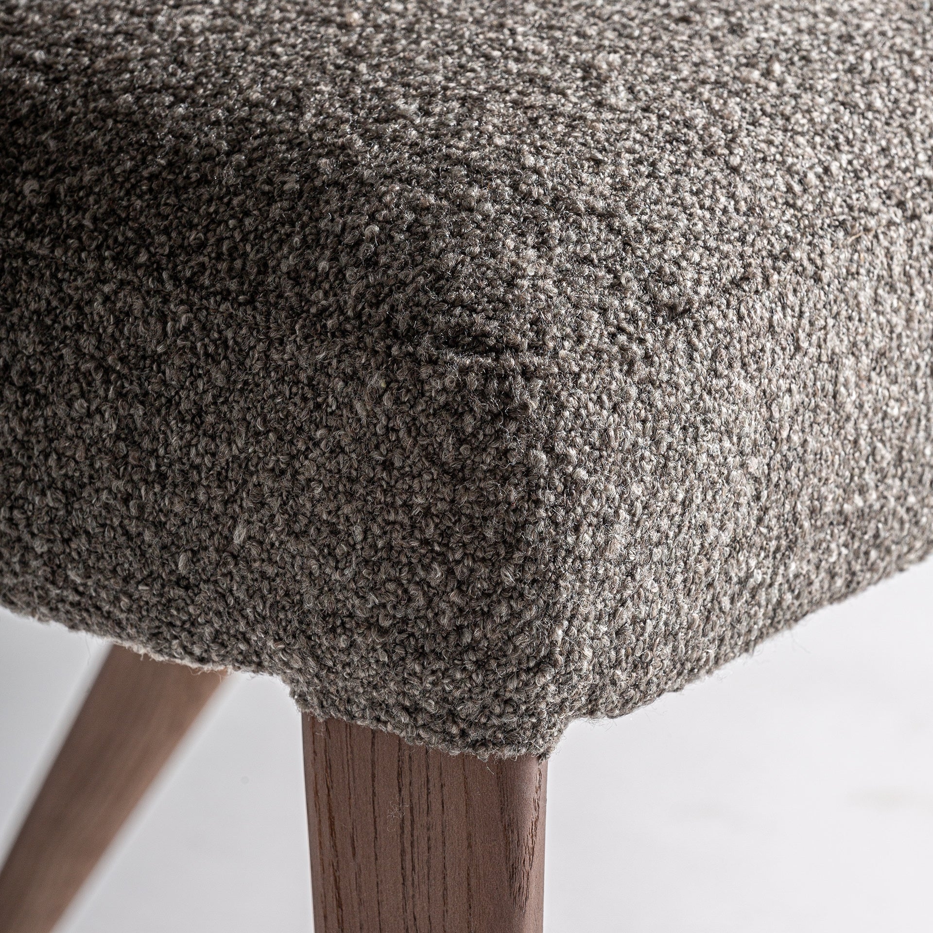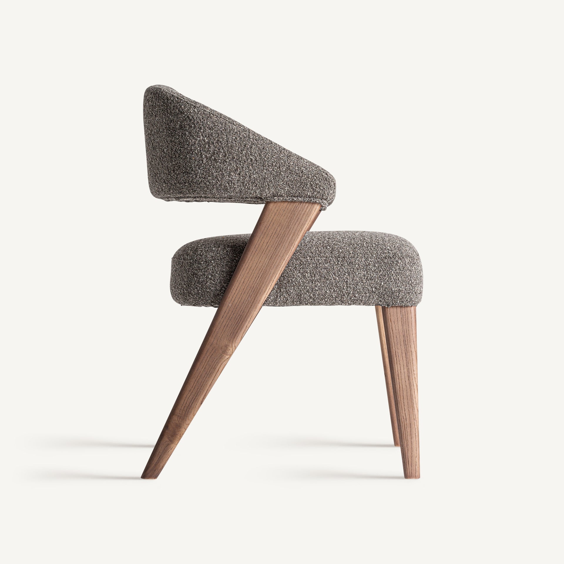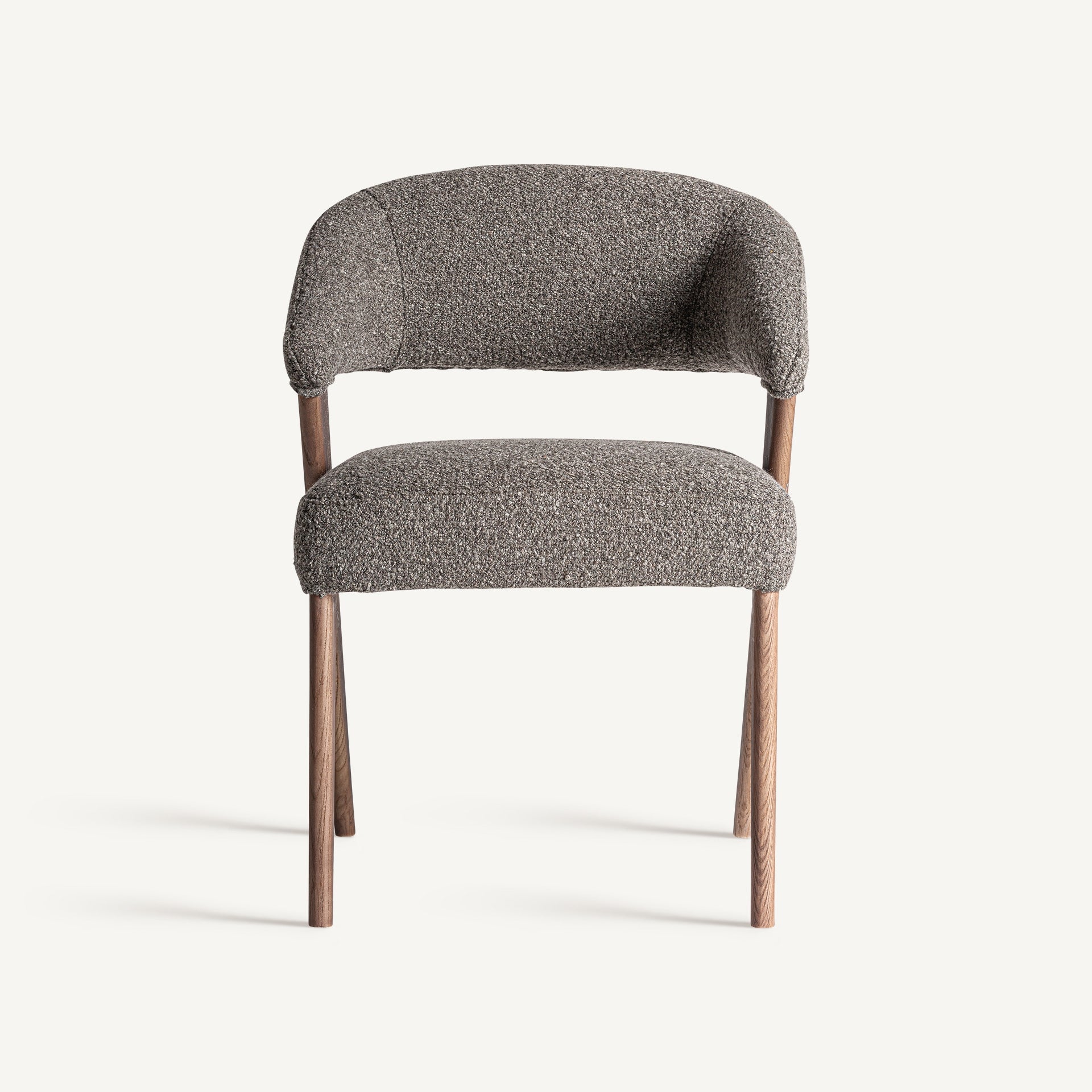 Столът Veney от VICAL, тапициран с пъстър сив полиестер, е поставен върху конструкция от кафяв дъб и каучуково дърво. Меките му линии и ергономичната облегалка предлагат удобно и елегантно изживяване при сядане.