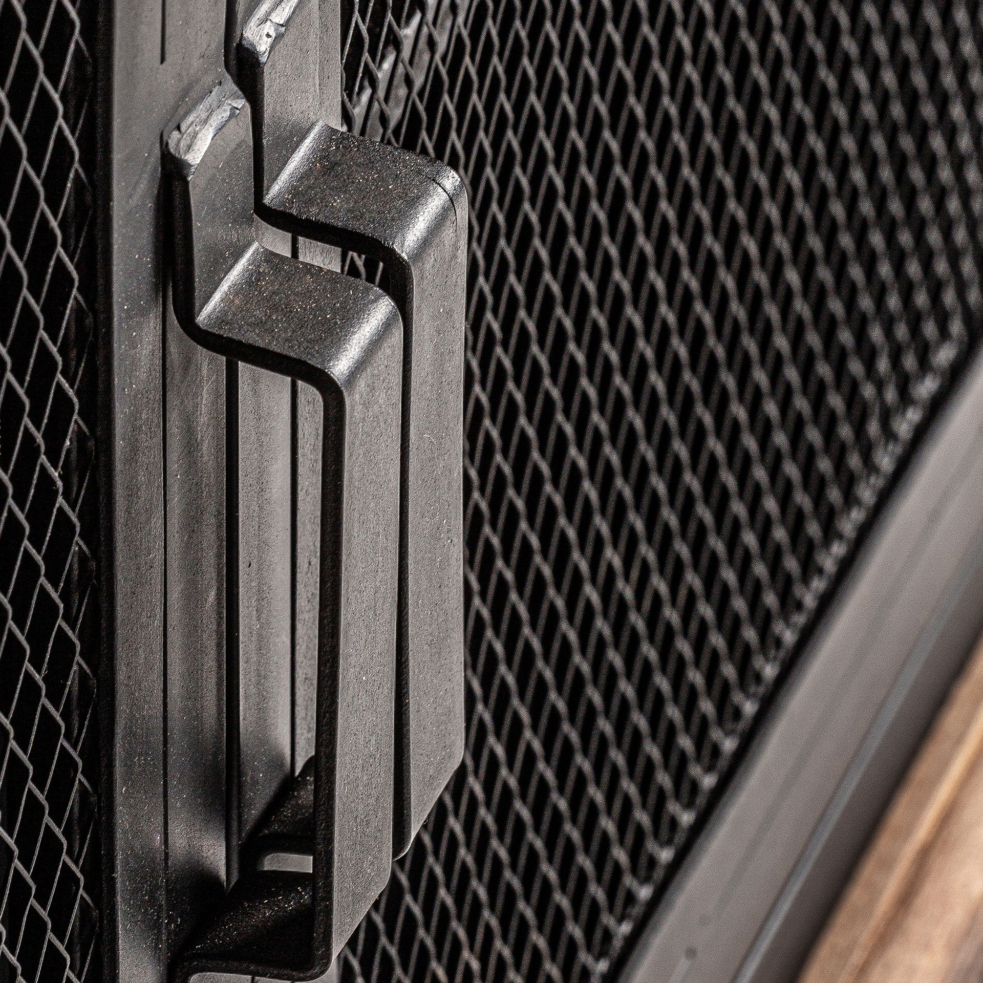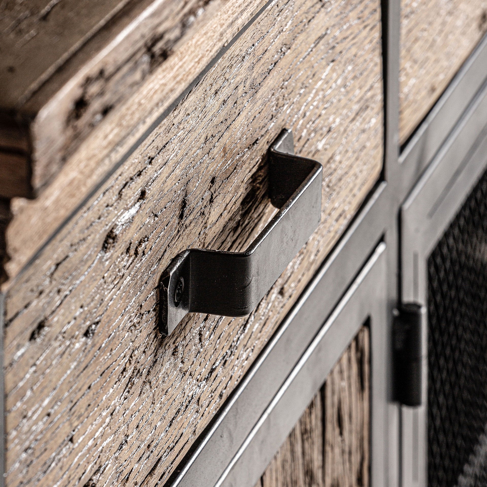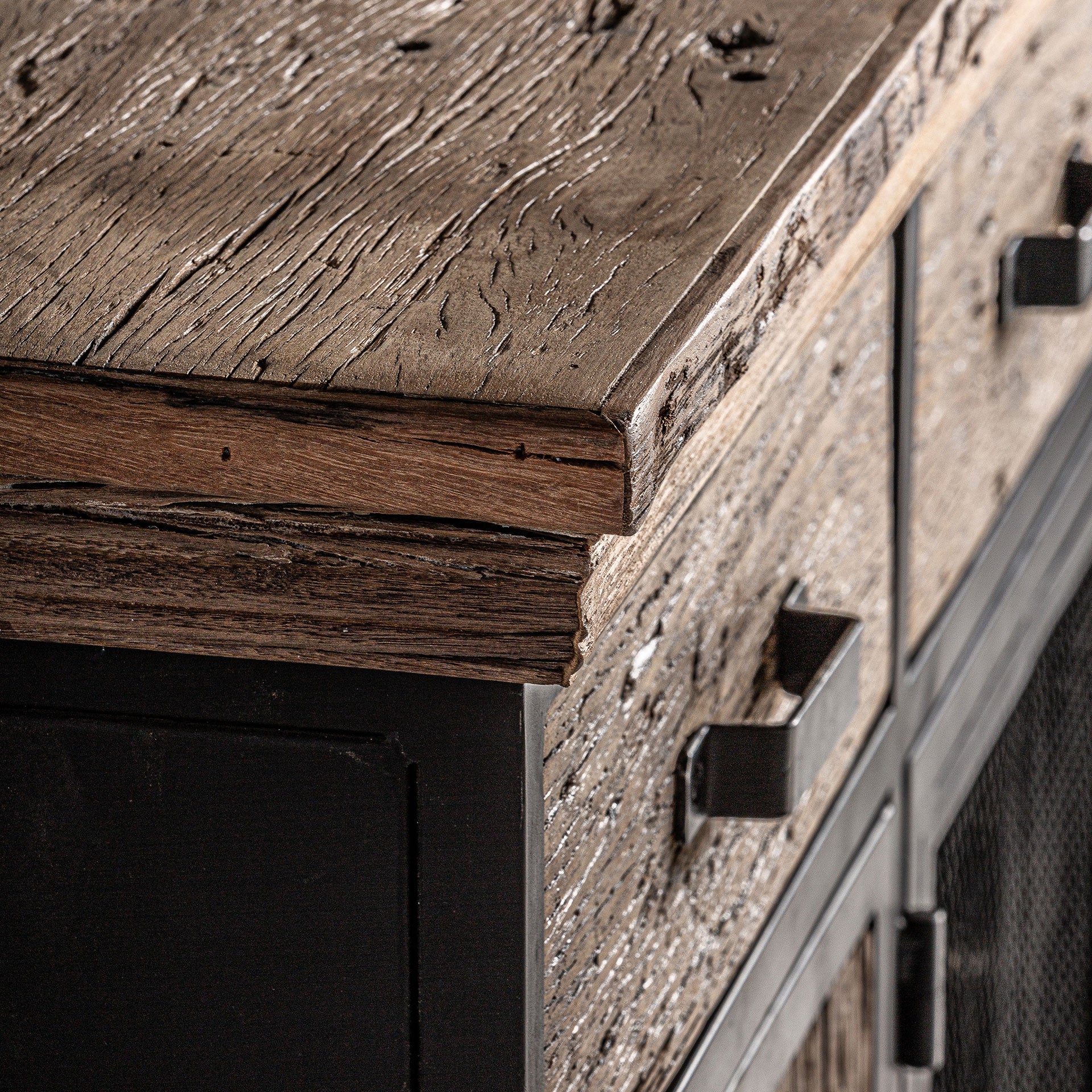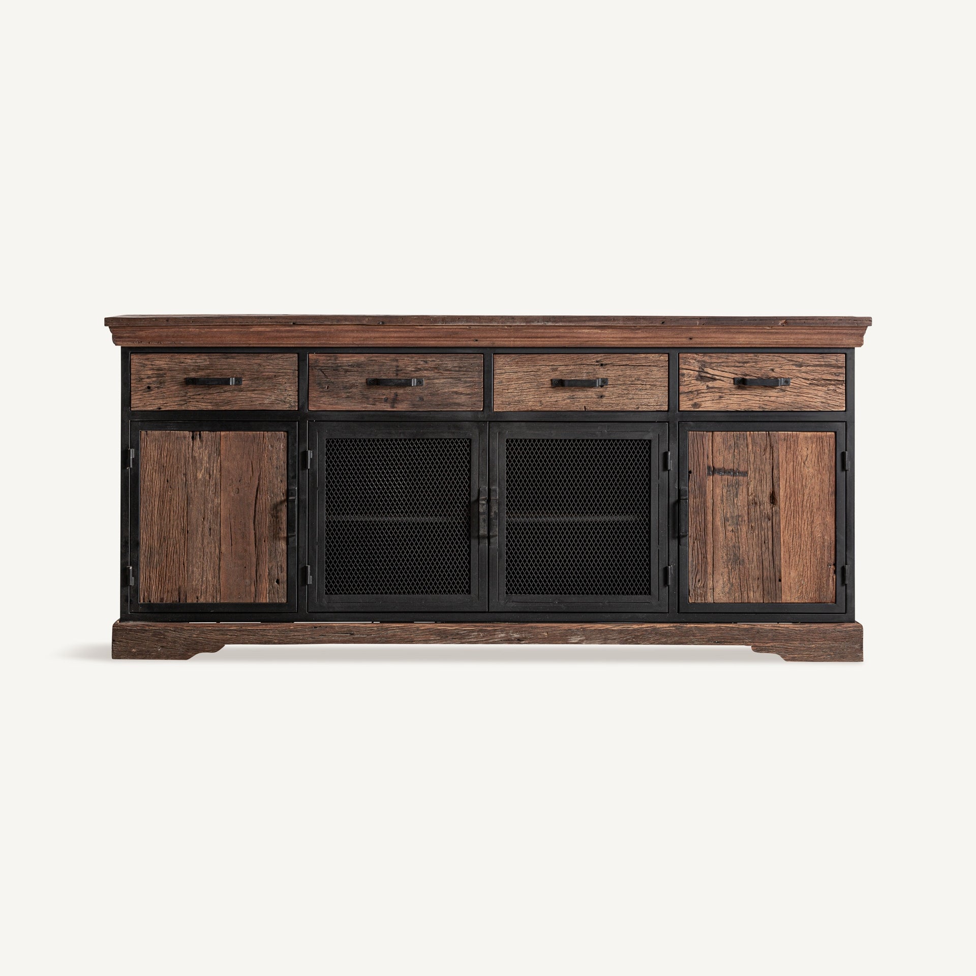 Изработен от топла кафява регенерирана дървесина, този бюфет разполага с две врати от масивна дървесина и две черни метални мрежести врати, съчетаващи рустик чар с индустриален привкус. Балансираното му оформление и естествените текстури предлагат както визуална привлекателност, така и практично място за съхранение, идеално за модерни трапезарии, лофтове или еклектични интериори.