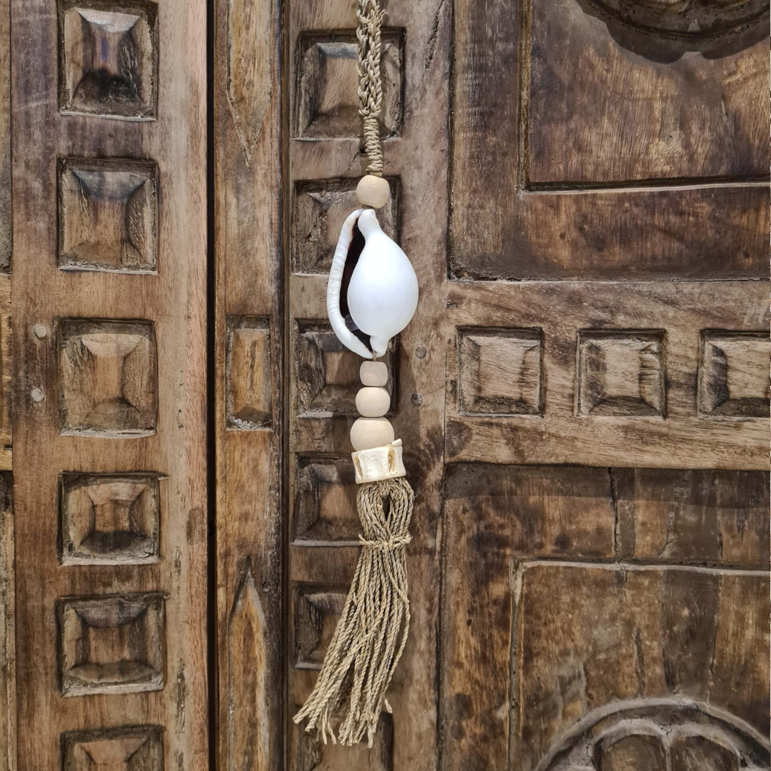 Жилищна верига или закачалка за врата. Ръчно изработен в Бали с красива бяла черупка и пискюл от въже за готино докосване. Закачете го където пожелаете. Или украсете в красива купа заедно с друга жива верига