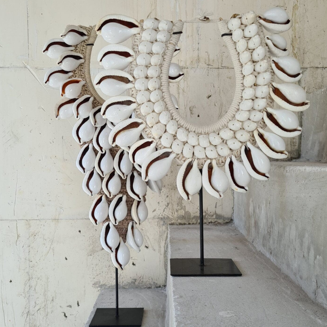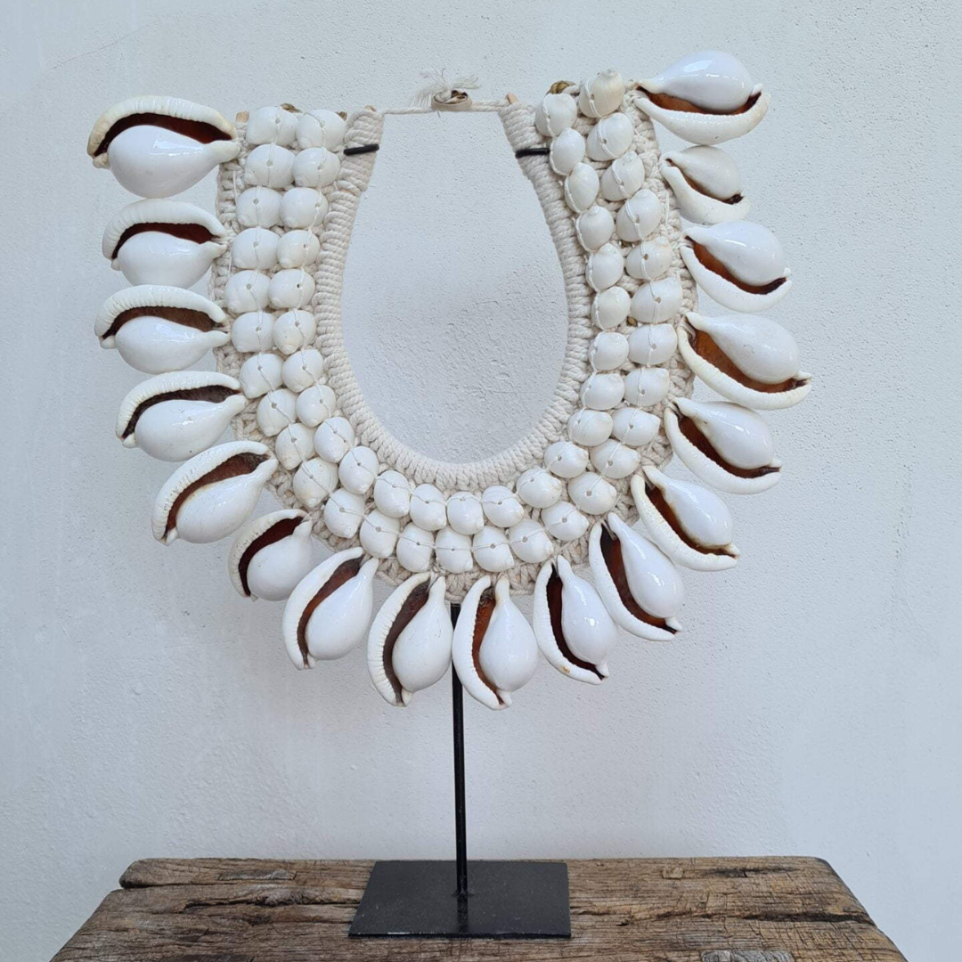 Това е страхотно колие от миди на стойка. Готин, но в бяло. Ръчно изработени от едри бели тигрови черупки.