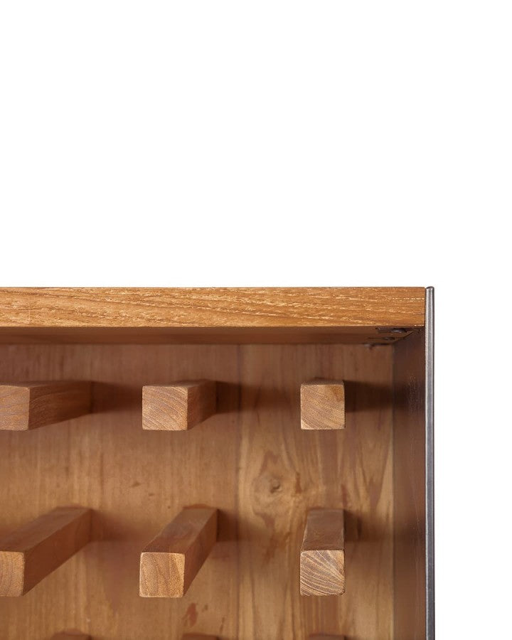 - Дървената стойка за вино WINE е модерна, елегантна и функционална дизайнерска мебел, която комбинира рециклиран тик и черно желязо в структурата си. Това парче е специално проектирано за съхранение или поставяне на бутилки от любимото ви вино. Със сложни, висококачествени покрития, WINE е конструиран от рециклирано тиково дърво, регенерирано от стари сгради в Ява, Индонезия, и ръчно изработено от нашите опитни занаятчии. Тази устойчива поставка за вино може да побере до 36 бутилки. Със своя индустриален стил, той ще бъде вашето перфектно допълнение в кухнята или всекидневната, тъй като освен функционалността си, той предоставя уникална и специална модерна естетика.