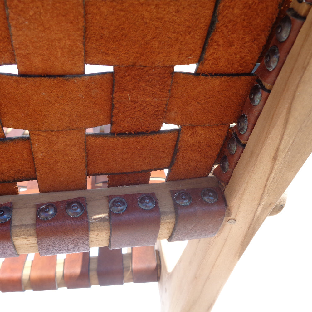 Материал : Рамка от тиково дърво / седалка, тапицирана с тъкани кожени ленти