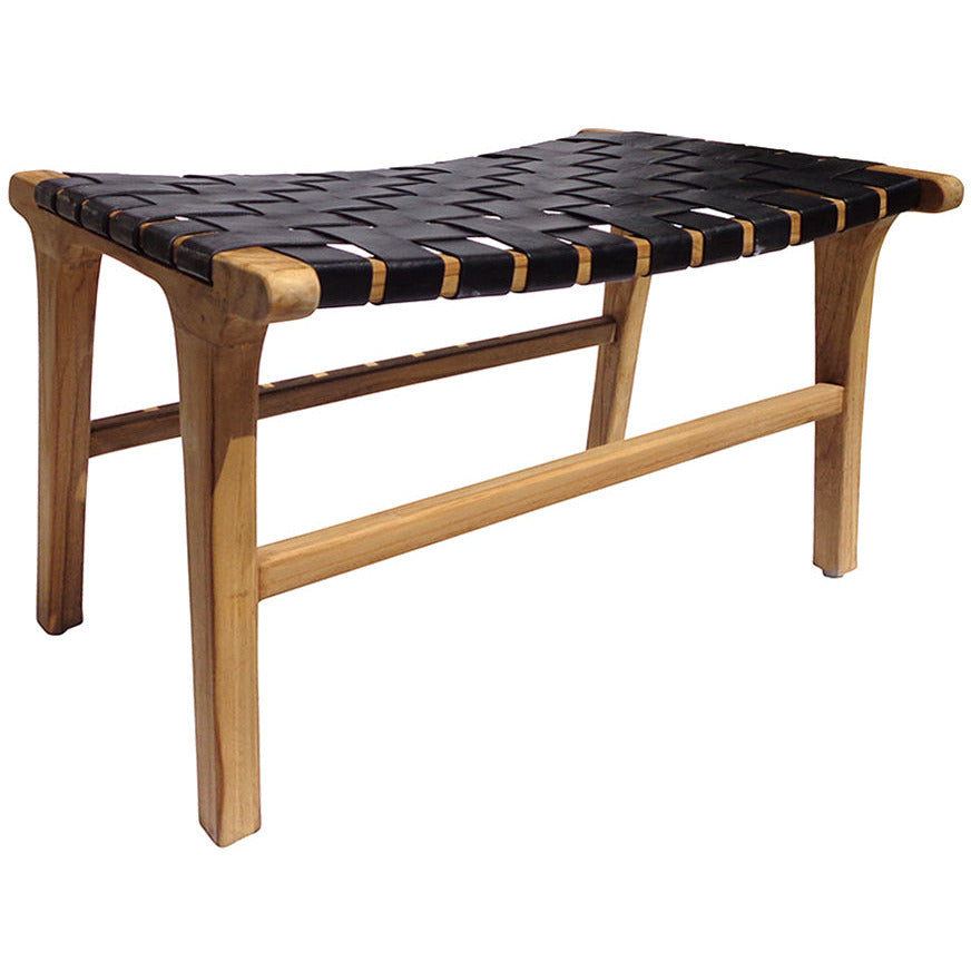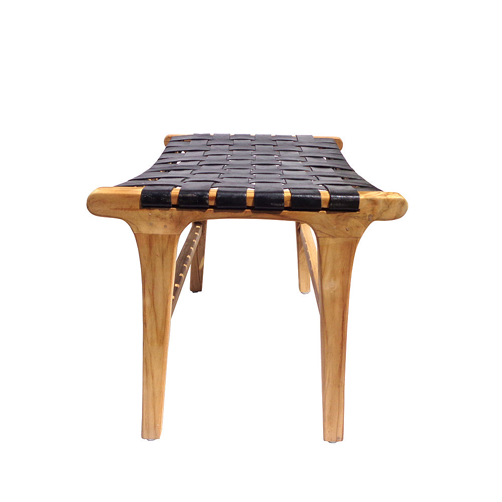Черният кожен стол ZUZI е с рамка от масивно тиково дърво, съчетана с ръчно тъкани кожени каишки, добавяйки уникален занаятчийски щрих към всяка спалня. Майсторски изработен, този стол съчетава издръжливост с изискан дизайн, подобрявайки едновременно комфорта и стила на вътрешните пространства. Идеален за поставяне в подножието на леглото, той добавя визуален интерес и подобрява цялостната атмосфера на вашата спалня.